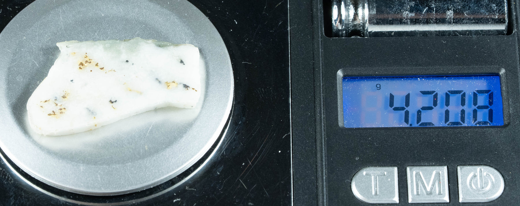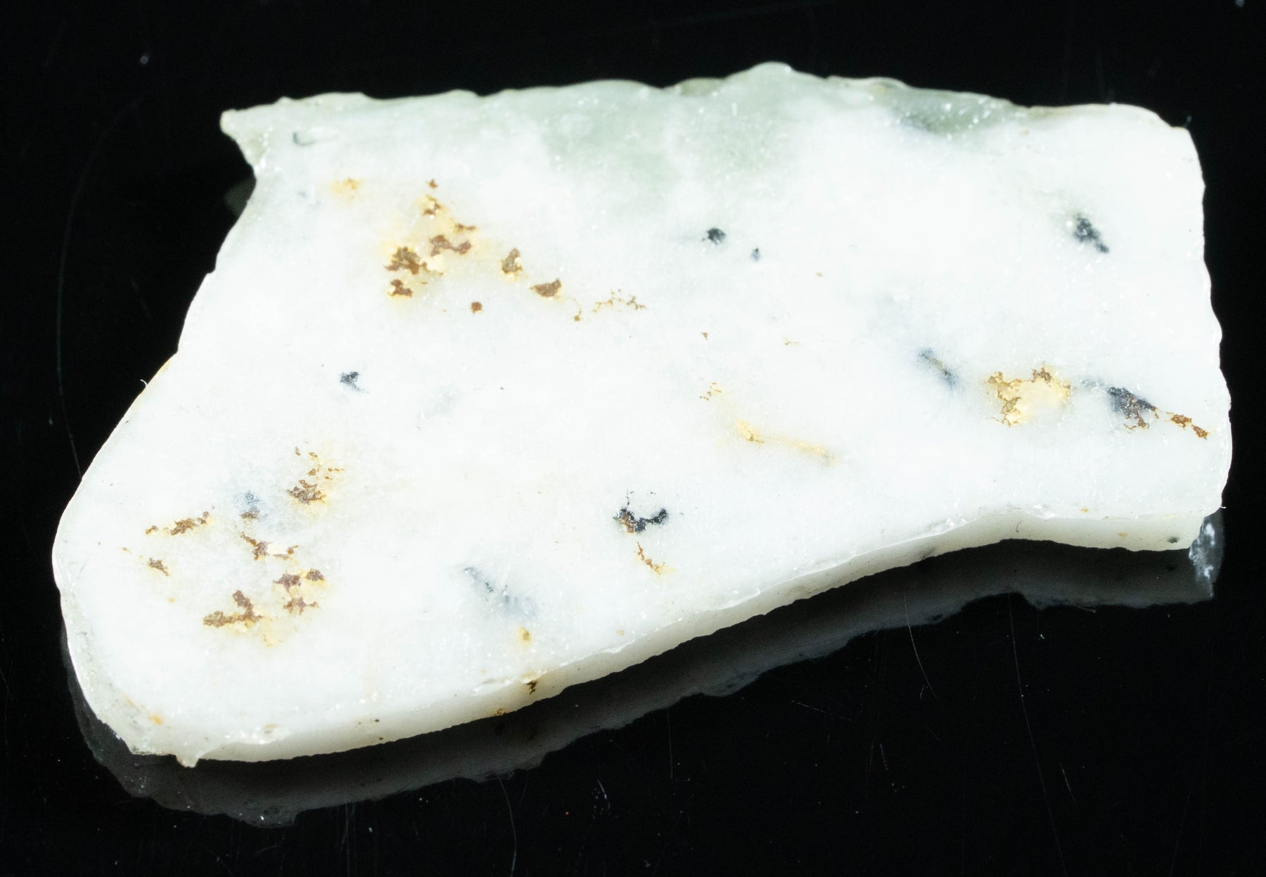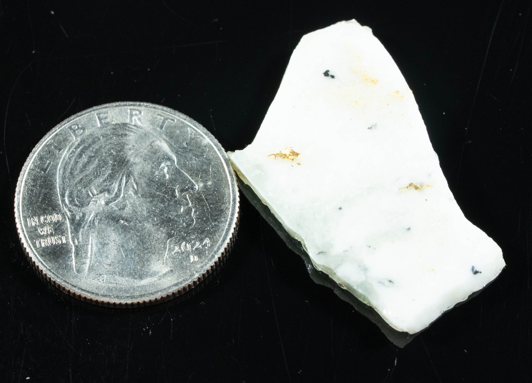 This 4.20 gram gold bearing quartz was found in the Sierra Mining District of Northern California. It is cut into slabs using diamond saw blades. The slabs range from 1-3 mm with an average of 2.3 MM thick. Each slab can be cut into smaller pieces for stones. The gold was formed in quartz deposits and when erosion took place these veins of gold would break out into the rivers and form individual gold nuggets or gold flake. The gold still left in the quartz is called gold bearing quartz or was called gold lode back in the eighteen hundreds. We often use Opticon to stabilize the quartz.