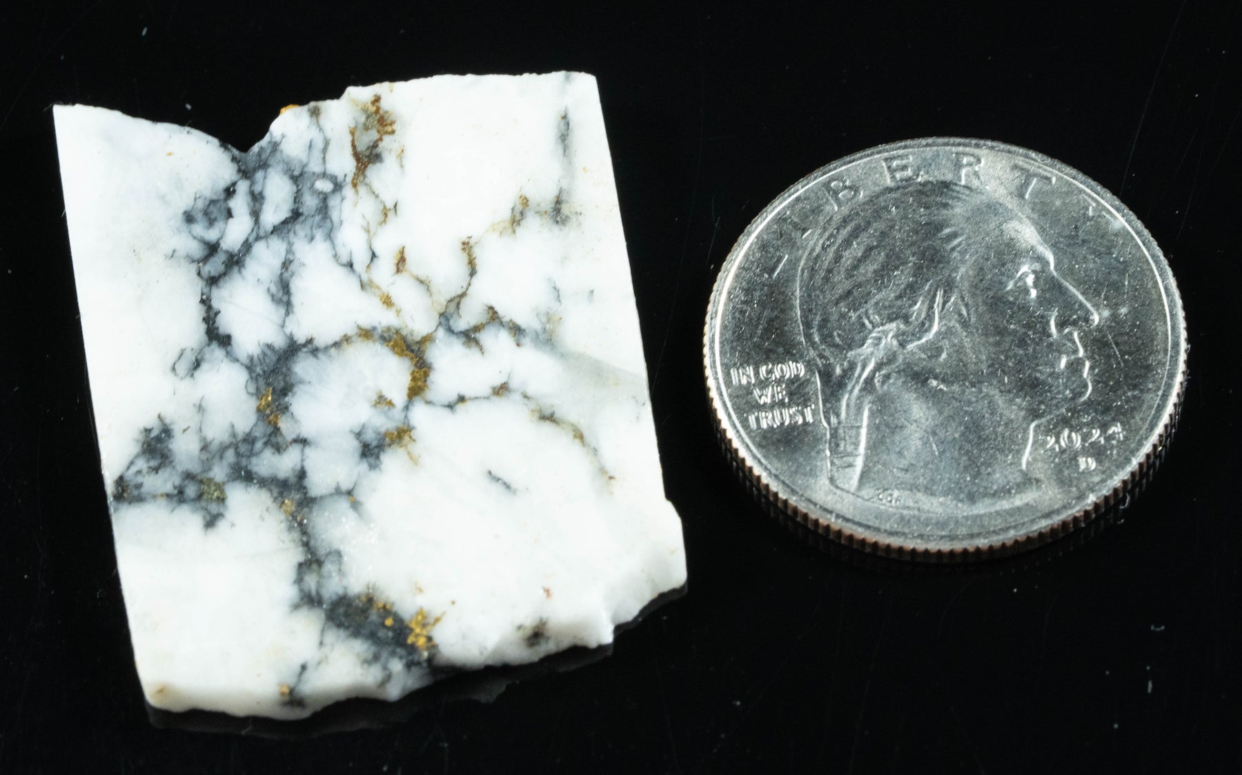 This 6.35 gram gold bearing quartz was found in the Sierra Mining District of Northern California. It is cut into slabs using diamond saw blades. The slabs range from 1-3 mm with an average of 2.3 MM thick. Each slab can be cut into smaller pieces for stones. The gold was formed in quartz deposits and when erosion took place these veins of gold would break out into the rivers and form individual gold nuggets or gold flake. The gold still left in the quartz is called gold bearing quartz or was called gold lode back in the eighteen hundreds. We often use Opticon to stabilize the quartz.