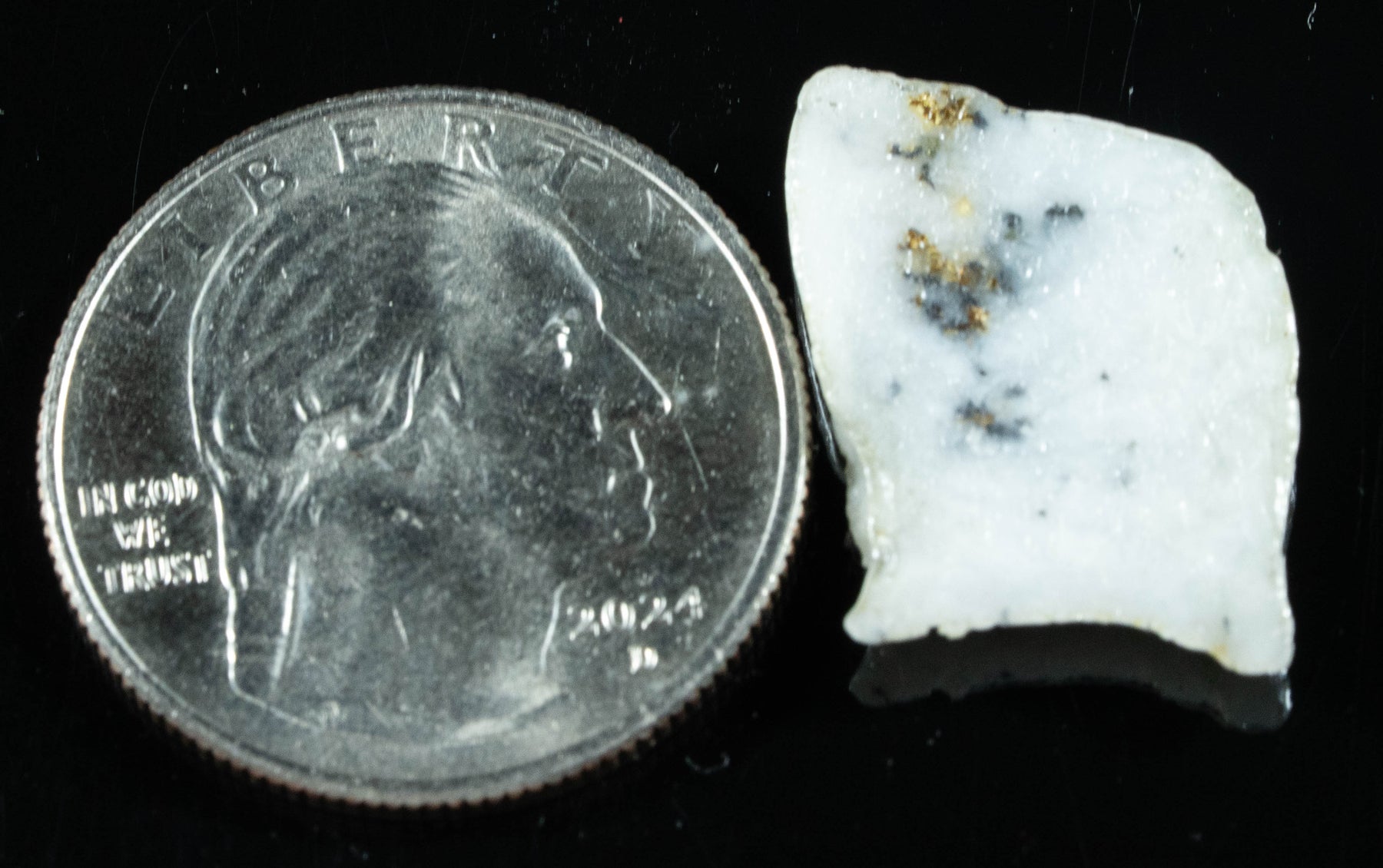 This 1.60 gram gold bearing quartz was found in the Sierra Mining District of Northern California. It is cut into slabs using diamond saw blades. The slabs range from 1-3 mm with an average of 2.3 MM thick. Each slab can be cut into smaller pieces for stones. The gold was formed in quartz deposits and when erosion took place these veins of gold would break out into the rivers and form individual gold nuggets or gold flake. The gold still left in the quartz is called gold bearing quartz or was called gold lode back in the eighteen hundreds. We often use Opticon to stabilize the quartz.
